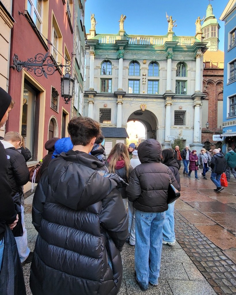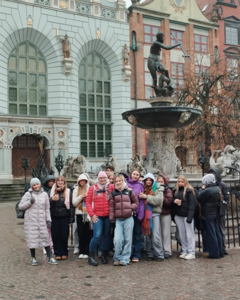 Z kolei 5 grudnia 2025 roku (piątek) uczniowie klasy III B wzięli udział w edukacyjnej wycieczce po Gdańsku. Trasa wiodła od Bramy Wyżynnej do Zielonej Bramy, a uczestnicy mieli okazję wysłuchać licznych opowieści związanych z gdańskimi kamienicami oraz ich dawnymi właścicielami. Wspólne zdjęcie pod pomnikiem Neptuna, wykonane wraz z Panią Dyrektor Bożeną Filimoniuk, oraz słodki poczęstunek w cukierni „Pellowski” przy ul. Długiej zakończyły część poświęconą zwiedzaniu miasta.