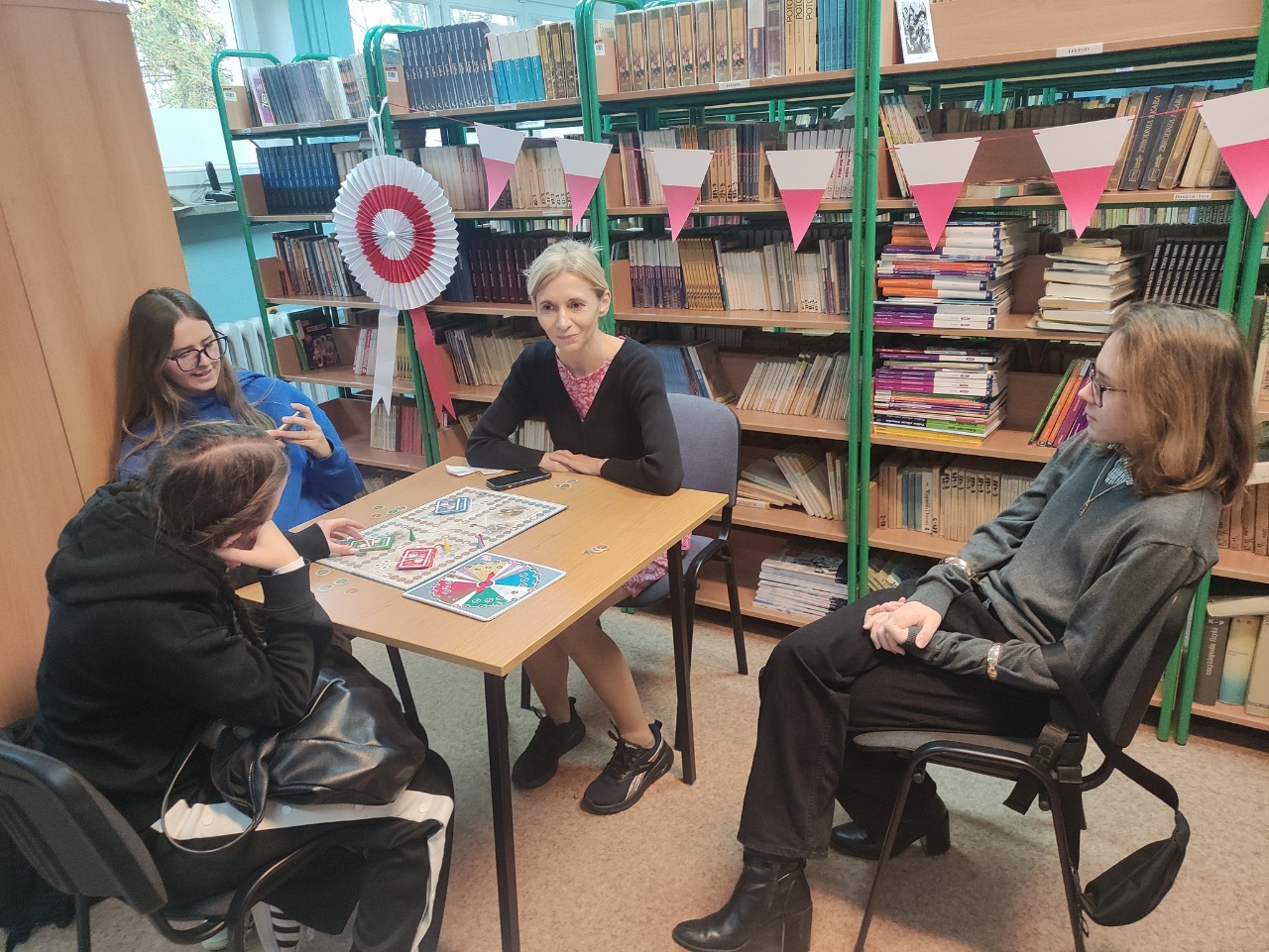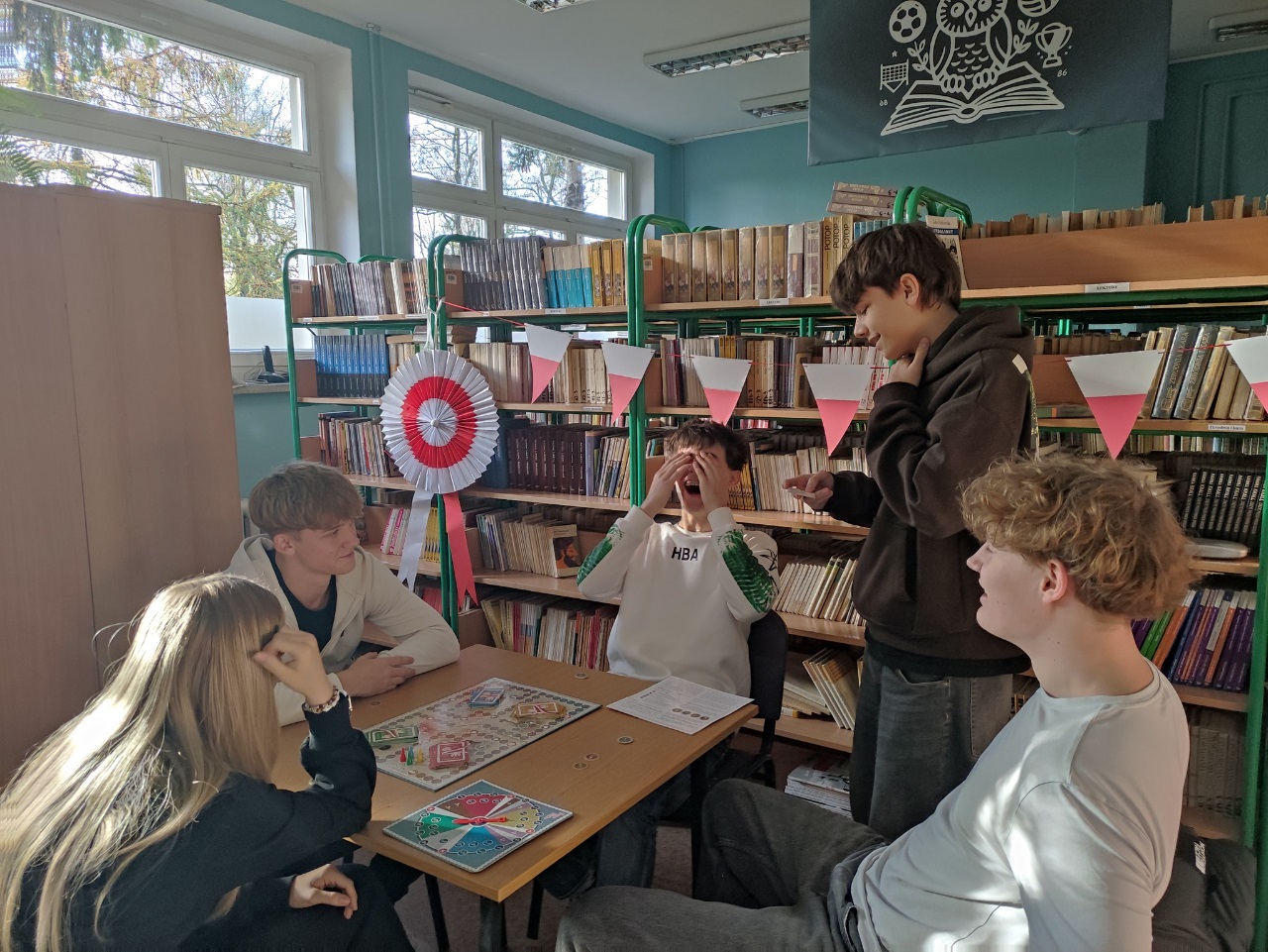 W ramach obchodów rocznicy odzyskania niepodległości chętni uczniowie spotkali się w szkolnej bibliotece, aby wziąć udział w rozgrywkach edukacyjnej gry planszowej poświęconej historii Polski.