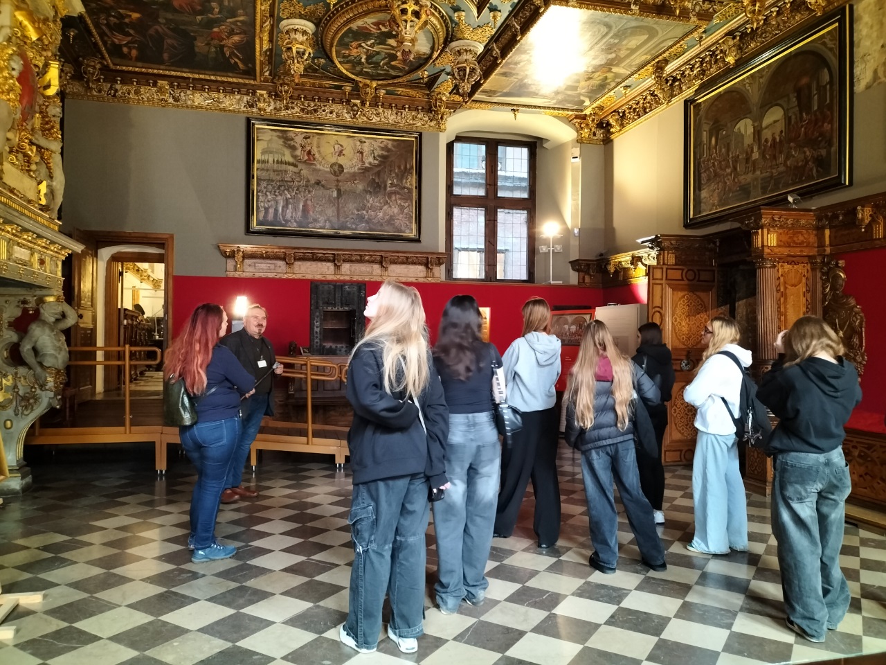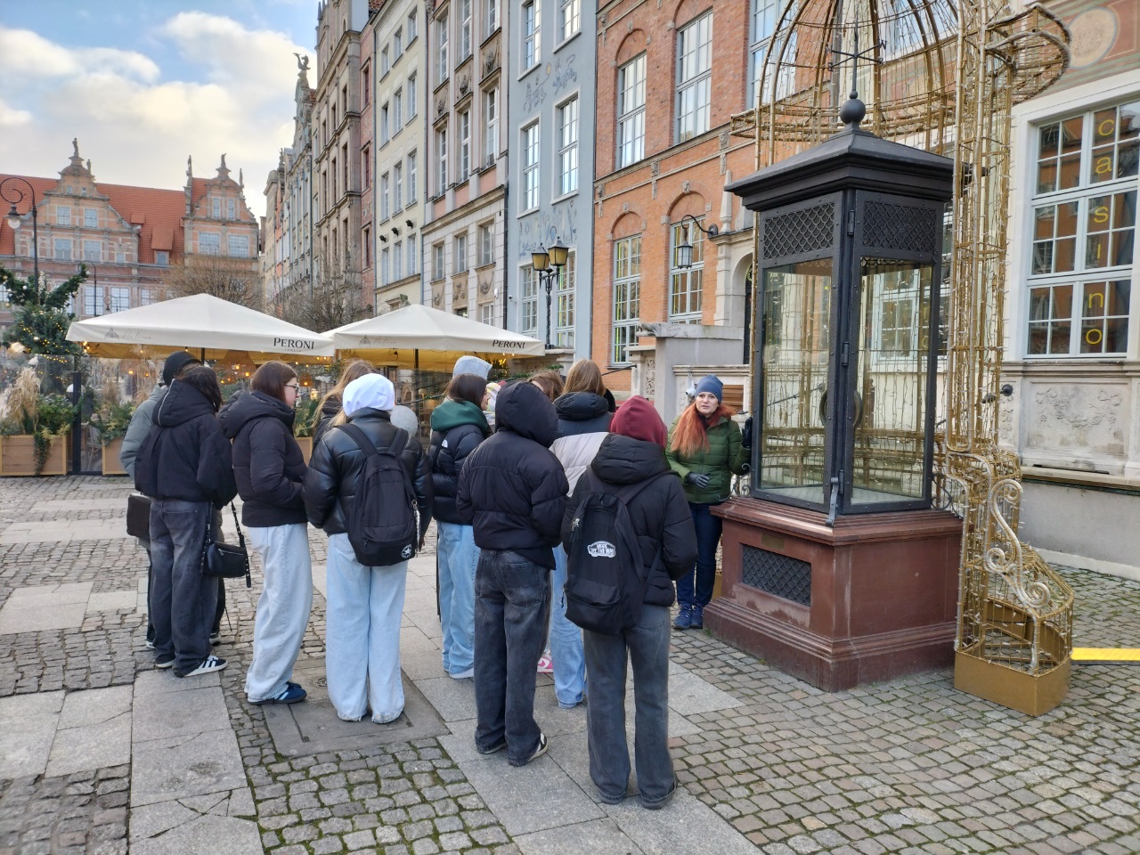 Po krótkim odpoczynku w cukierni „Pellowski”, gdzie była okazja do skosztowania słodkości i wypicia gorącej herbaty, grupa kontynuowała zwiedzanie. Kolejnym punktem programu był Ratusz Głównego Miasta, będący jedną z najcenniejszych budowli świeckich w Polsce. Uczniowie poznali historię jego powstania, zniszczeń w czasie II wojny światowej oraz powojennej odbudowy. Z wieży ratusza rozległ się dźwięk carillonu – zespołu dzwonów wygrywający melodie miejskie, tradycję tę w Gdańsku pielęgnuje się już od XVI wieku.