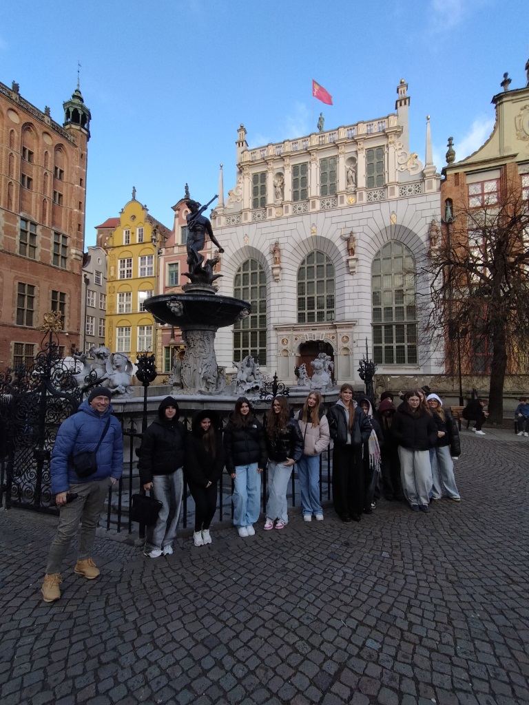 Spacer Drogą Królewską doprowadził grupę pod Dwór Artusa – miejsce spotkań kupców i elity miejskiej. Ciekawostką jest, że we wnętrzu Dworu znajduje się jedna z największych w Europie renesansowych kaflowych komód piecowych, mierząca ponad 10 metrów wysokości. Uczniowie zatrzymali się również przy słynnej Fontannie Neptuna, która od XVII wieku jest symbolem Gdańska.