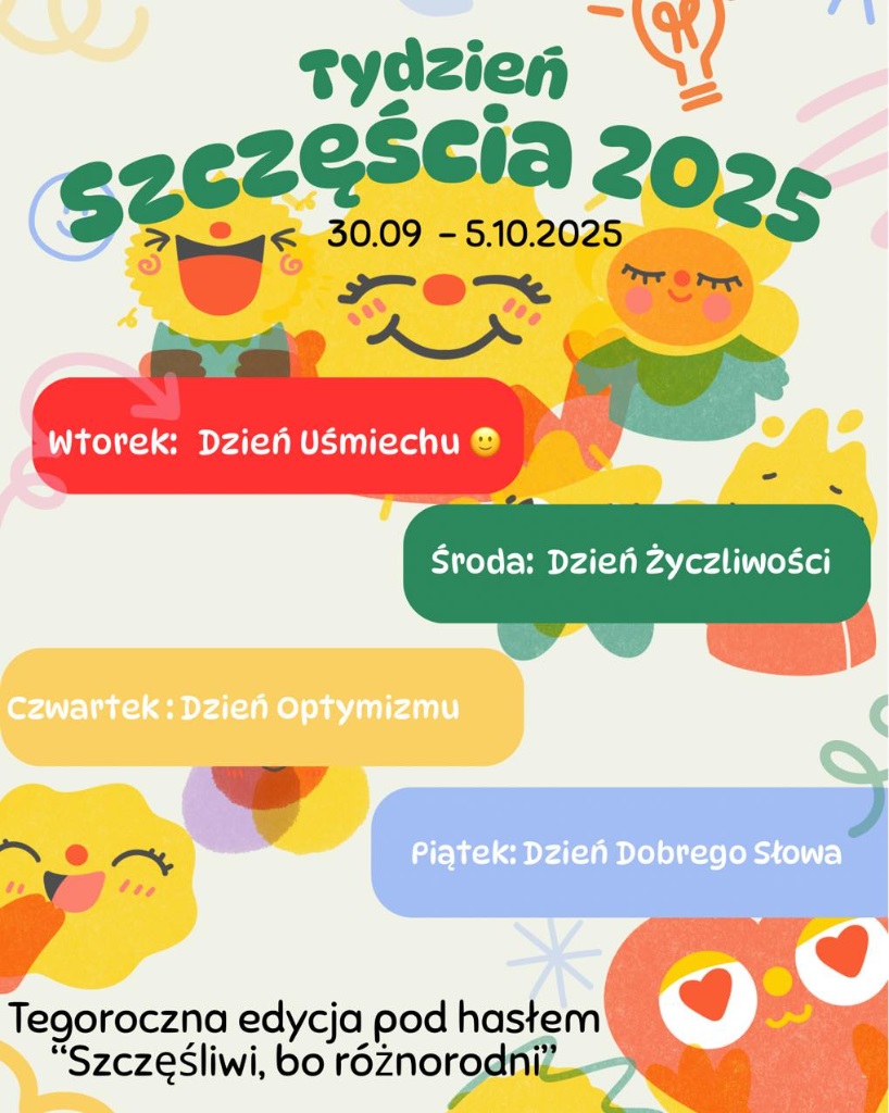 W dniach 29 września – 5 października 2025 odbędzie się VI Ogólnopolski Tydzień Szczęścia w Szkole. Jest to inicjatywa, która ma na celu popularyzację naukowego podejścia do szczęścia i dobrostanu w placówkach edukacyjnych i kulturalnych. W wydarzenie mogą włączać się szkoły, przedszkola, uczelnie, biblioteki, domy kultury oraz różne instytucje związane z edukacją, angażując dzieci, młodzież oraz dorosłych.