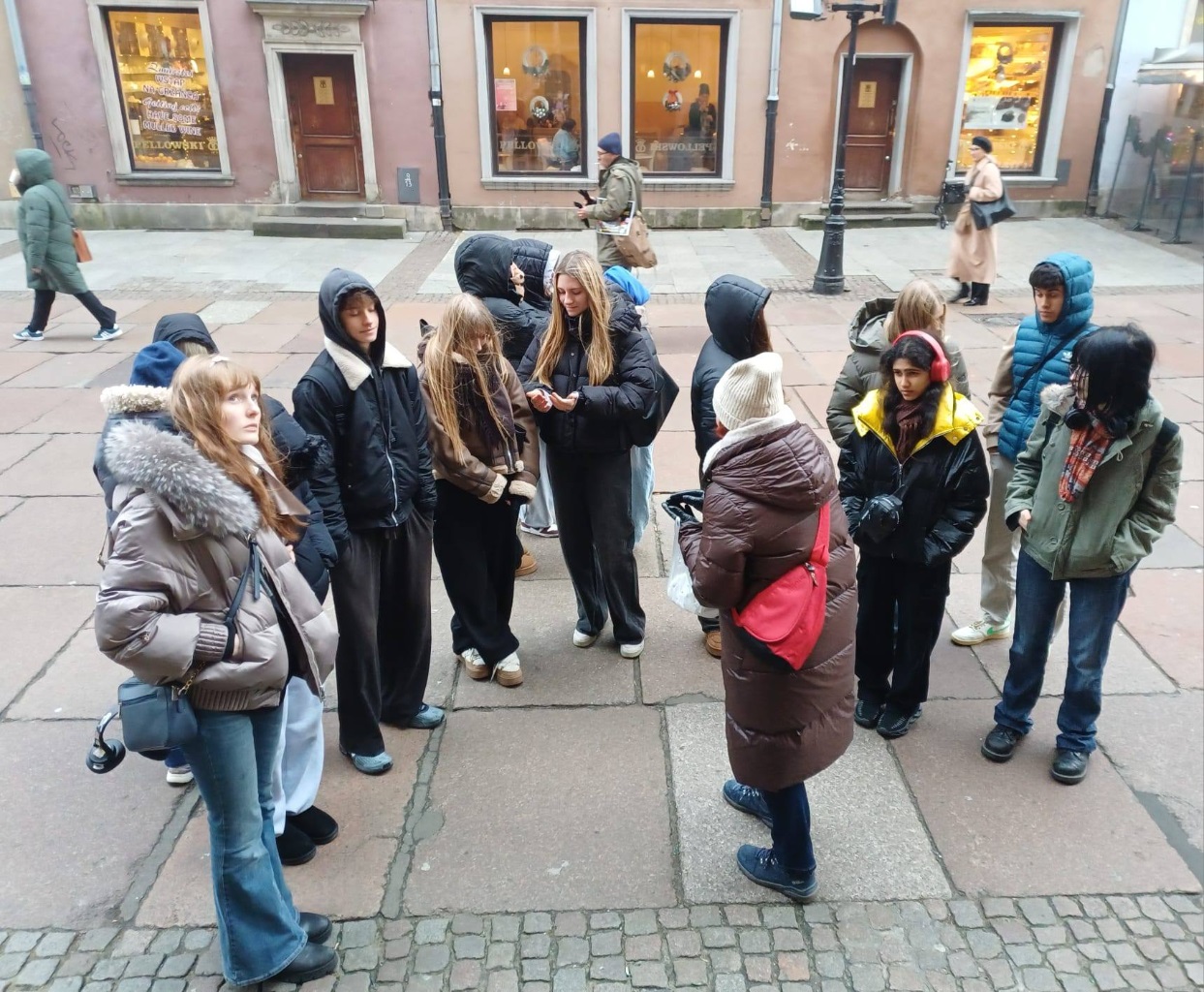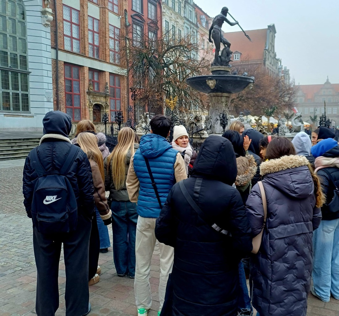 Mimo pochmurnego nieba i niskiej temperatury nie zrezygnowaliśmy z poznawania historii Gdańska. Naszą przewodniczką była pani Anna Fischer, która oprowadziła klasę 2b od Błękitnego Baranka aż do Złotej Bramy. Po drodze podziwialiśmy m.in. Bramę Zieloną, Fontannę Neptuna oraz termometr Fahrenheita, a także zrobiliśmy krótką przerwę na rozgrzewkę w cukierni Pellowski. Całości towarzyszyła świąteczna atmosfera Bożonarodzeniowego Jarmarku.